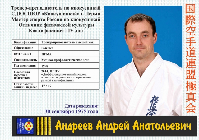 3 июля 2016 года в подмосковном городе Бронницы прошел «ТИТАН триатлон» (половинка, суперспринт) 2016. Это один из стандартов триатлона в котором участник должен проплыть — 1,93 км, проехать на велосипеде — 90 км и пробежать — 21,1 км (полумарафон). Этот формат еще называют Half-Ironman «Полужелезный человек». В этом серьезном испытании принял участие известный боец мастер спорта, сэнсей Андрей Андреев, который еще несколько лет назад защищал на татами цвета российского флага, а сейчас успешно преподает киокусинкай в пермской СДЮСШОР.По словам Андрея Андреева, выступления по киокушину в ветеранском формате уже не приносят былого удовольствия, а травмы заживают все дольше.