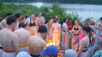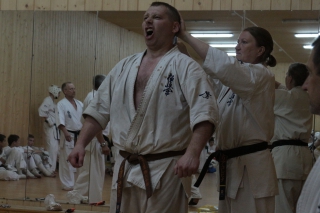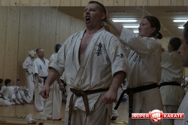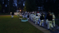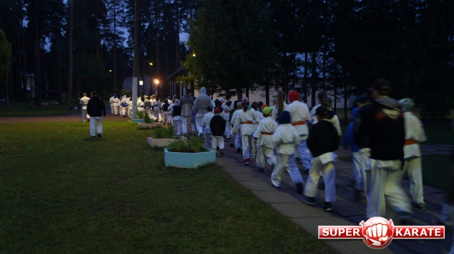 криками вызвали Бога Нептуна - попали под проливной дождь во время кросса - но, к счастью, он был непродолжительным."Ночная тренировка, как правило, проводится перед экзаменом. Подъем в 3 часа ночи. Кросс под громкие крики толпы "Эйшо-Тейшо-Киокушинкай", кихон, ночные купания, костер. Люди непросвещенные воспринимают все, как ритуал секты "людей в белом". Бегут прочь. И даже открещиваются.