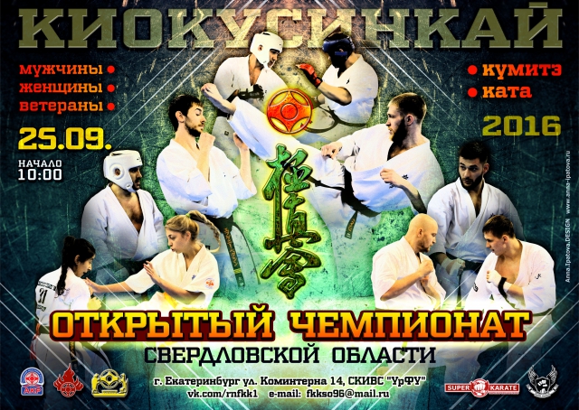 25 сентября 2016 года в Екатеринбурге прошел Открытый Чемпионат Свердловской области по киокусинкай среди мужчин, женщин, ветеранов (кумитэ, ката). В турнире приняли участие около 60 спортсменов, в том числе и бойцы из других регионов – Челябинской и Курганской областей, Пермского края, Республики Башкортостан, ЯНАО и Санкт-Петербурга.