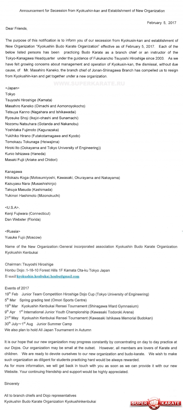 Но главный и возможно сокрушительный удар - выход из кекусин-кан Цуёси Хирошиге и создание им новой организации.