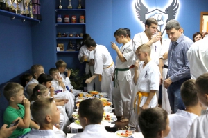 Чистые комфортные раздевалки, душевая, стены коридоров завешены постерами киокушиновских турниров. Зона рецепции, кабинет руководства, «малый зал» для силовых тренировок. И, конечно же, большой тренировочный зал, где много света, новенькое татами, флаги, а на стенах – артефакты с чемпионатов мира.