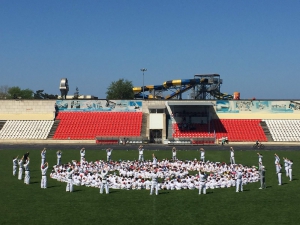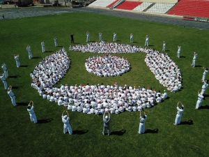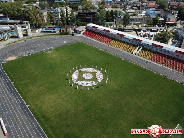 Всего несколько минут и на свежем, сочно зеленом газоне, появляется невероятный белый узор. Это Канку, созданная 650 спортсменами и их тренерами, во время учебно-тренировочных сборов Краснодарской Краевой Федерации Киокусинкай под руководством Шихана Тагира Таирова.