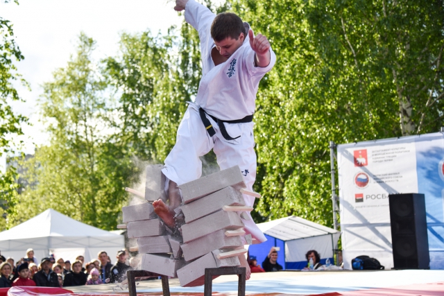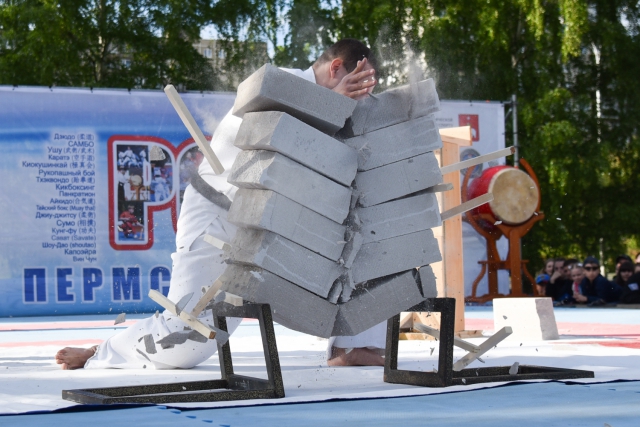 Завершился фестиваль грандиозным «тамешивари» - разбиванием не защищенными частями тела бетонных блоков, в исполнении спортсменов Федерации киокусинкай Пермского края.