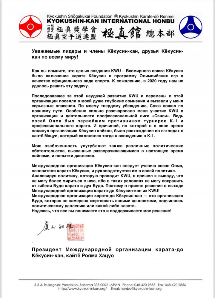 Кайтё Хацуо Рояма в открытом письме объяснил свою категоричную позицию по отношению к KWU - Всемирному союзу Кёкусин. Если тезисно, то - цели не достигнуты, ориентиры потеряны, приоритеты подменены.