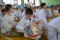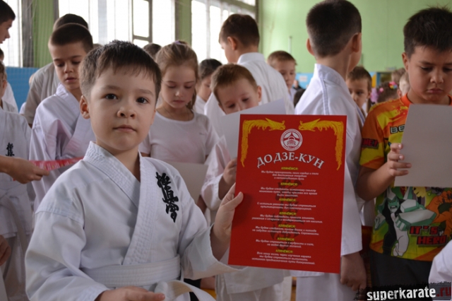 Каждому новичку вручили азбуку Додзекун - свод правил каратиста. Для родителей устроили показательные выступления. В этом году торжественную клятву Киокушина прочли 98 новичков.