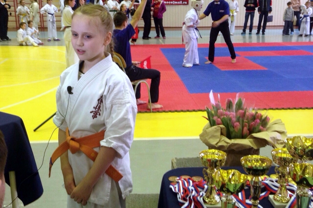Церемония награждения стала самым красивым и торжественным моментом турнира: каратистки в белоснежном кимоно и с букетиками тюльпанов.