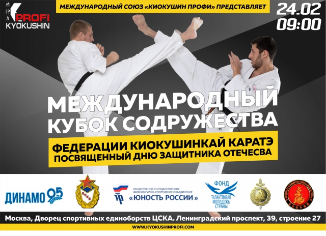 24 февраля 2109 года в московском Дворце спортивных единоборств ЦСКА (Ленинградский пр., 39, строение 27, Москва) пройдет Международный Кубок Содружества и четыре боя по правилам Киокушин Профи.