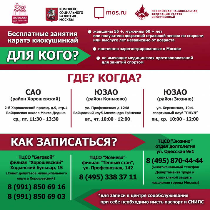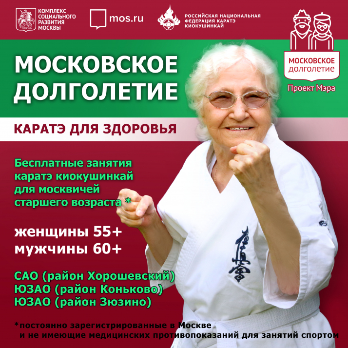 Российская Национальная Федерация Каратэ Киокушинкай с 1 сентября 2022 года открывает двери сертифицированных залов для москвичей старшего поколения в рамках социального проекта мэра Москвы «Московское долголетие». Это крупнейший оздоровительный, образовательный и досуговый проект для пенсионеров столицы.