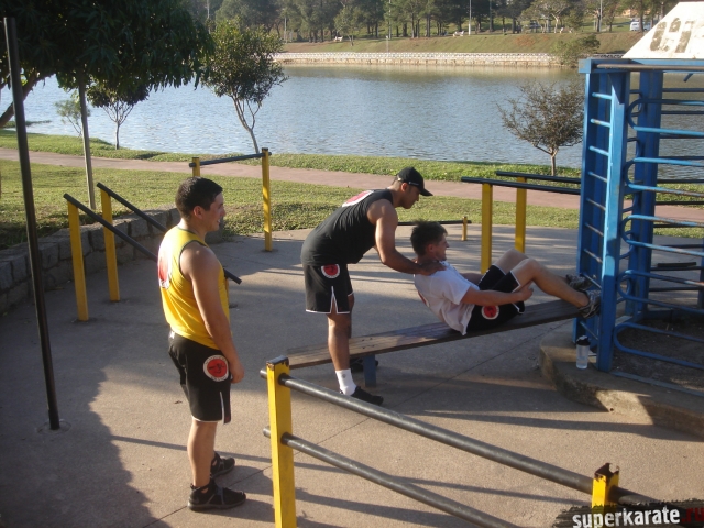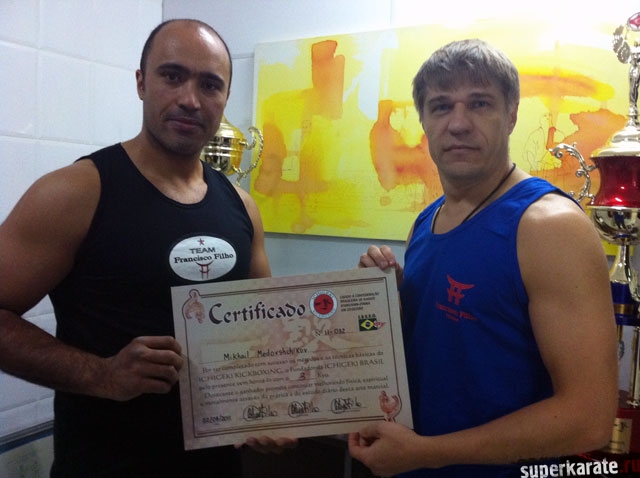 Ввиду заложенной киокушиновской базы и хорошей подготовки по ОФП, Шихан Филио допустил Михаила к сдаче сразу на 3 кю (голубая футболка). Всего экзамен сдавали 7 человек, но только один из них - Рашн Крэйзи Мен, как его там называют за несгибаемую волю - оставался стоять, сдавая кихон без перерыва от 10 до 3 кю. Кстати, Шихан Филио не показывает технику, а просто ее называет. Причем во время тренировок он называл ее по-английски, а на тесте, либо чтобы проверить смекалку, либо просто уйдя в себя, говорил исключительно по-португальски. После теста на физическую подготовку (отжимания, прыжки на скакалке и т.д.) были бои по правилам К-1. После - подведение итогов, объявление баллов за каждый раздел экзамена. Серж, второй учи-деши, месячный курс которого подошел к концу (чему он очень рад!), сдал экзамен на зеленую футболку.