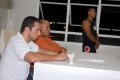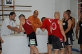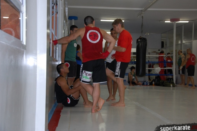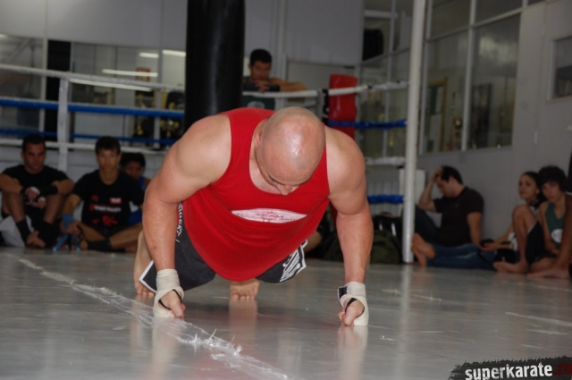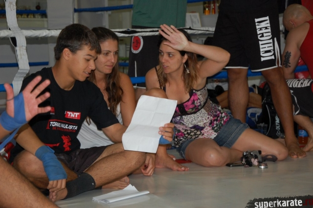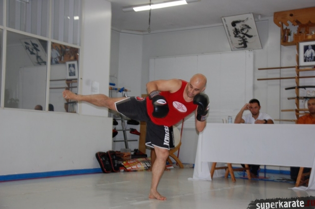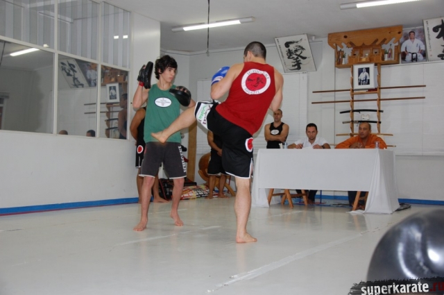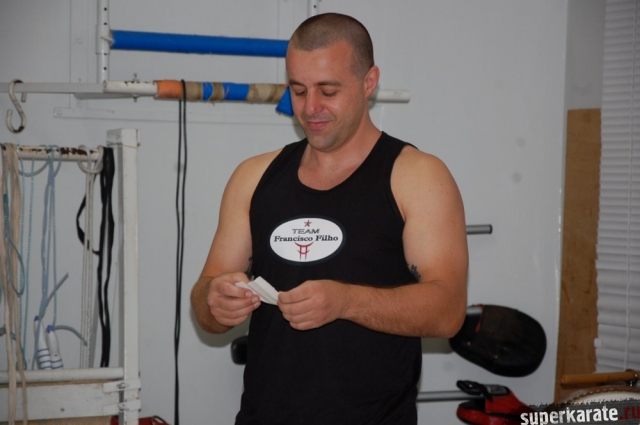Сэнсей Фабиано вносил в доджо черепицу и бетонные блоки. На наш вопрос: «Зачем? Ведь в кик-боксинге нет тамешивари!», он загадочно улыбнулся и с португальским акцентом произнес: «Сюрпрайз!». За столом сидели двое экзаменаторов – Сэнсэй Марко и Шихан Филио. Сэнсэй Фабиано и Эндрюс Накахара были ассистентами, одними из первых, кто уже имел черную футболку.