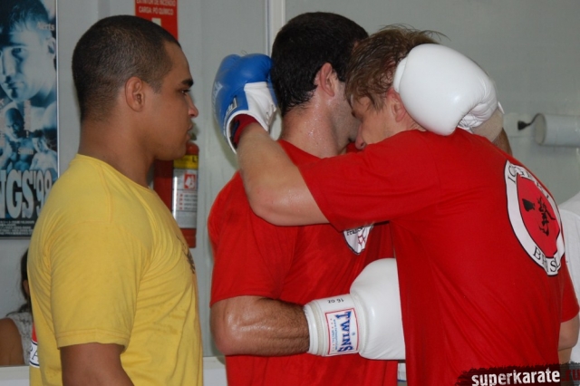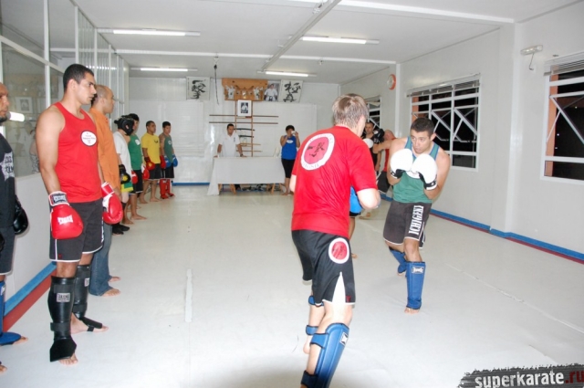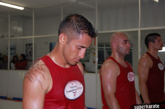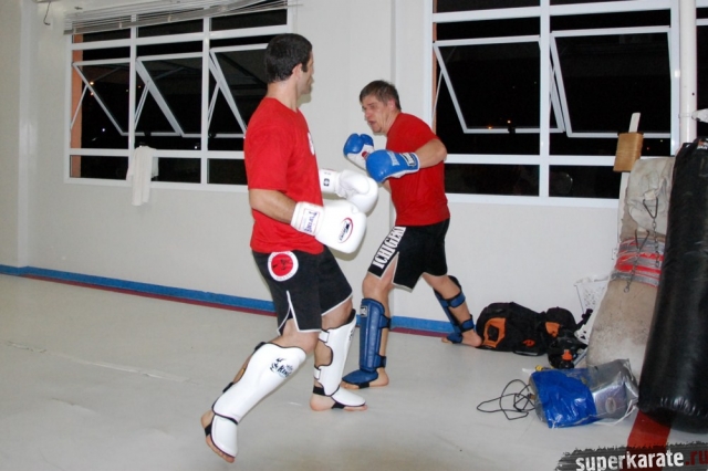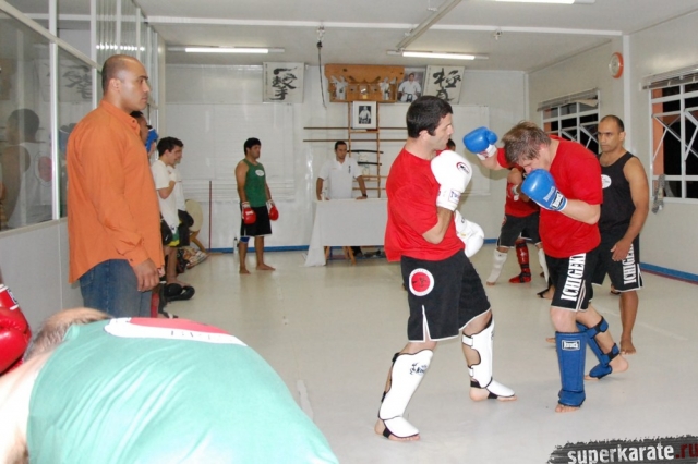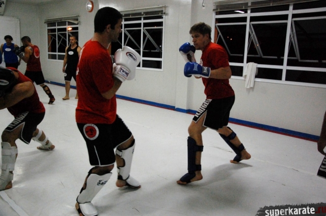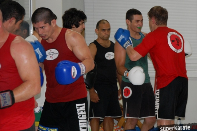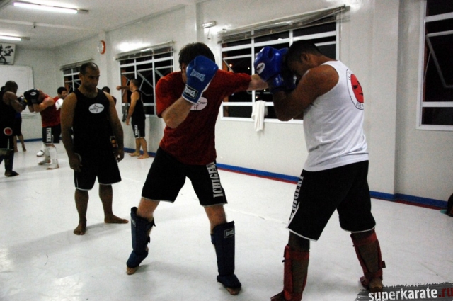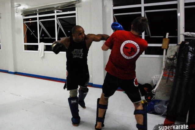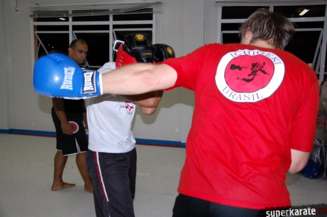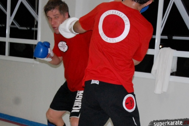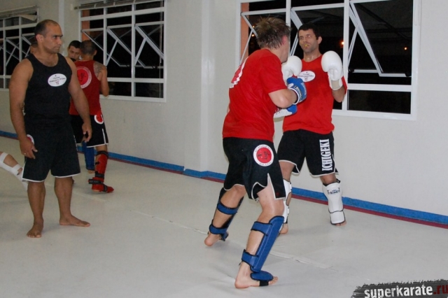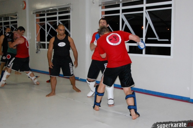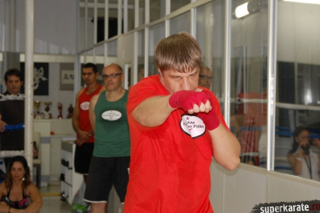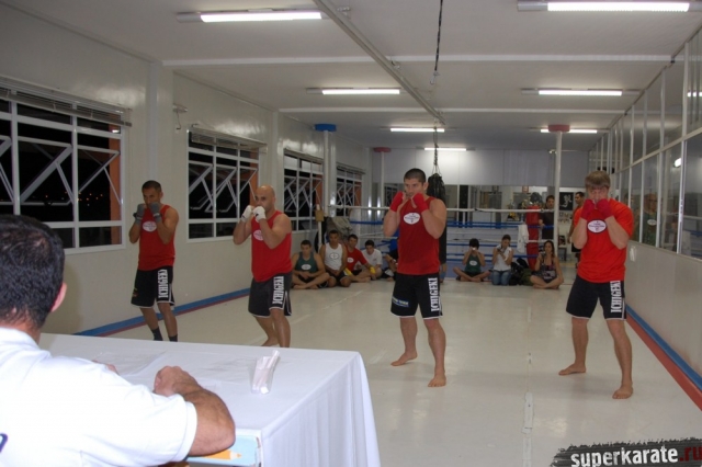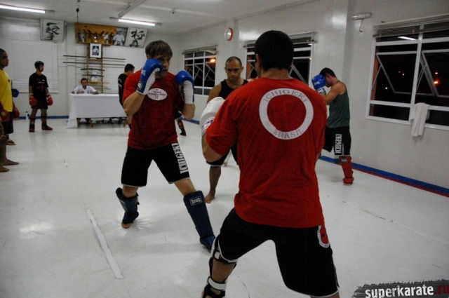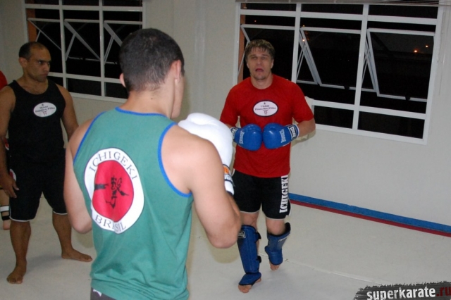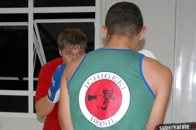 Кихон на месте - «буквы» – удары руками и ногами. Команды только на португальском, счет то на японском, то на португальском, то на английском. Что говорят - разобрать русскому уху не представляется возможным. Но наш Сэнсей тут уже три месяца... Ему даже несколько раз доверяли проводить тренировки на португальском языке! Он уверенно и без малейших ошибок наносит удар за ударом по воображаемому противнику...