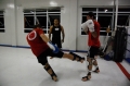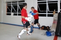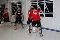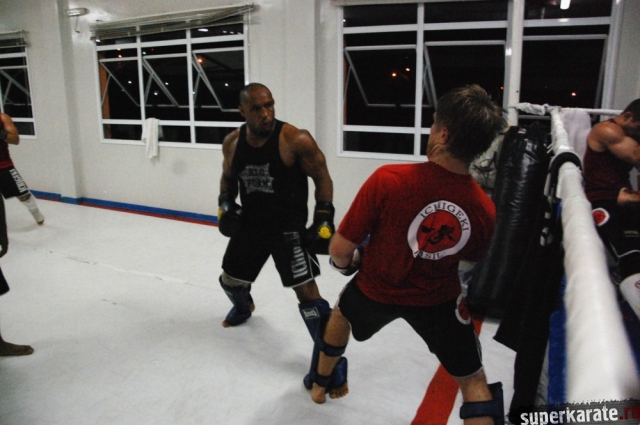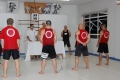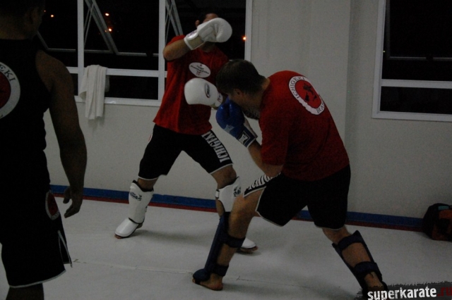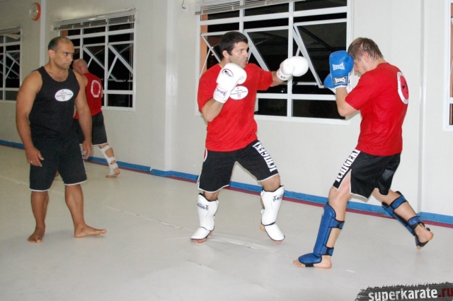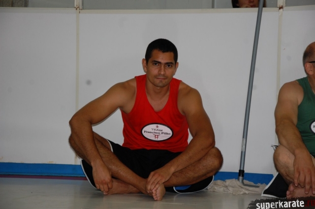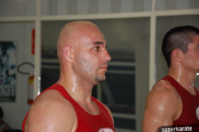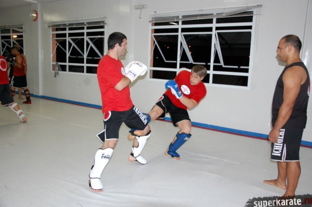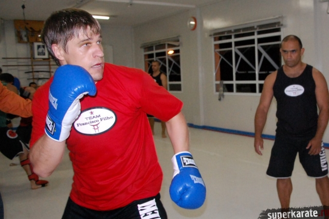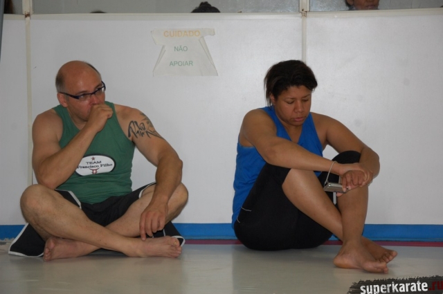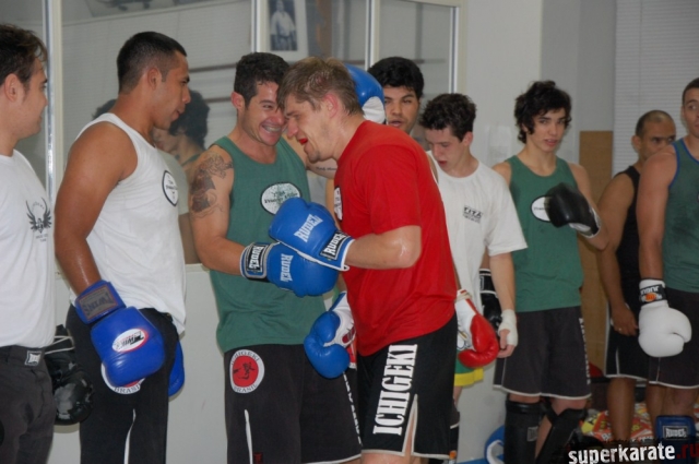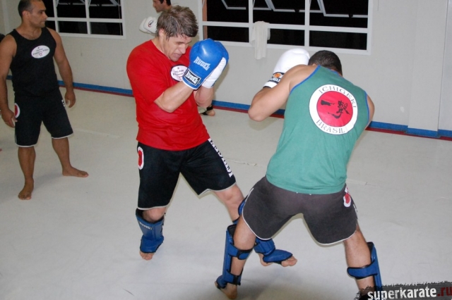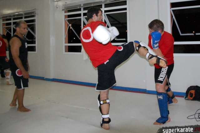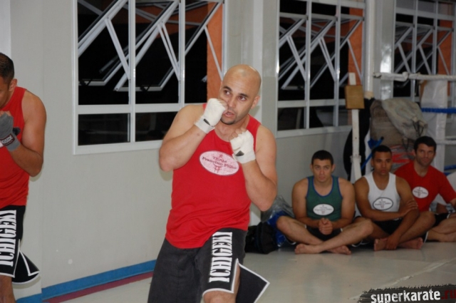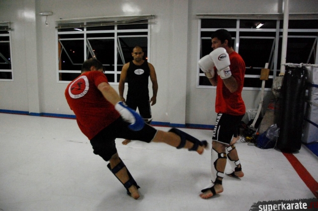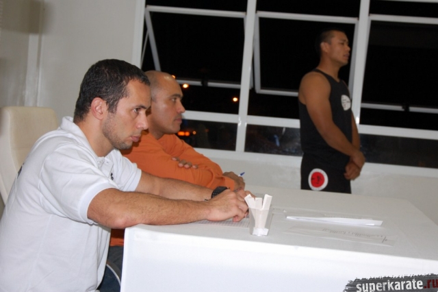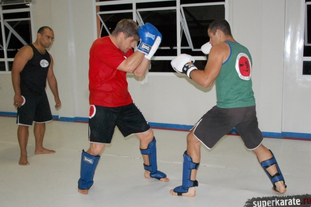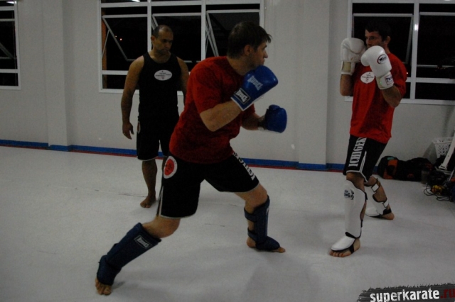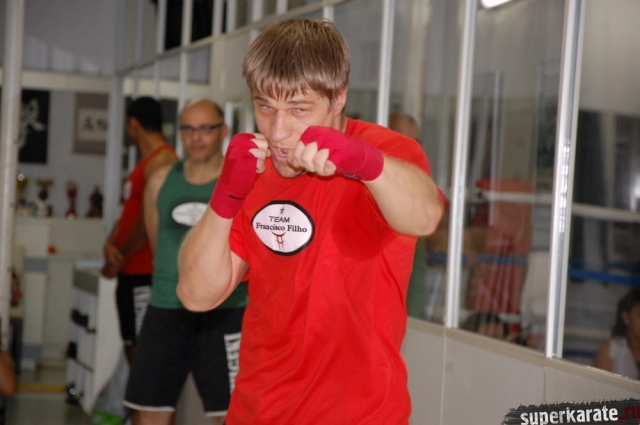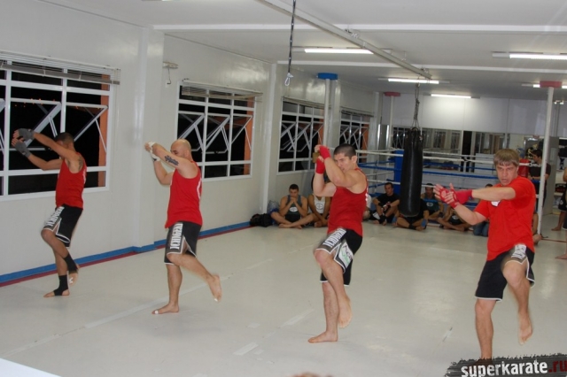 Кихон на месте - «буквы» – удары руками и ногами. Команды только на португальском, счет то на японском, то на португальском, то на английском. Что говорят - разобрать русскому уху не представляется возможным. Но наш Сэнсей тут уже три месяца... Ему даже несколько раз доверяли проводить тренировки на португальском языке! Он уверенно и без малейших ошибок наносит удар за ударом по воображаемому противнику...