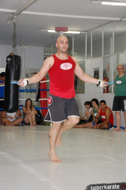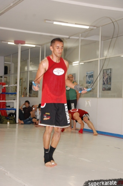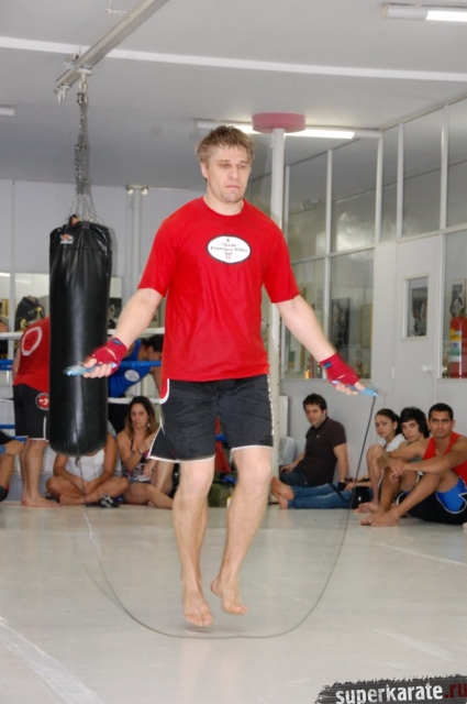 Скакалка – 400 раз за 2 минуты. Получается нужно прыгать 3-4 раза в секунду. Можно сразу сказать, что с этим разделом экзамена не справился никто. Кто-то прыгнул 378, кто-то 350, кто-то 340. Но до 400 раз за две минуты никто не добрался. Этот норматив выполняет только один человек... Чемпион Мира по Киокушинкай, основатель "Академии Ичигеки", Шихан Франциско Филио.
