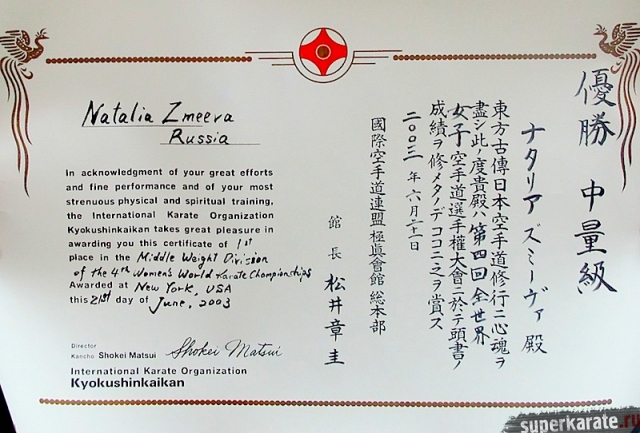 Путь к чемпионству огромный труд, десять лет изнуряющих тренировок предшествовали самой главной ее победе на татами. Но именно финальный бой Наталье запомнился на всю жизнь. В том поединке Наталья получила первую и единственную за всю каратисткую карьеру травму. С нарушением правил соперница сломала ей нос, но преодолев все Наталья сумела вырвать победу. Её боевой дух оценили по достоинству, именно она получила приз "За волю к победе", что теперь документально подтверждает переданный хозяйке сертификат.