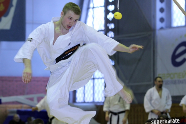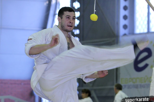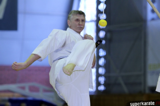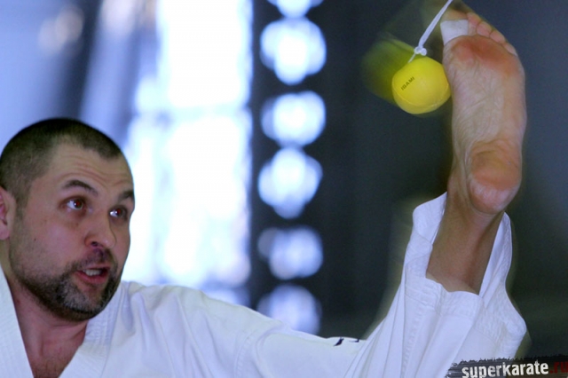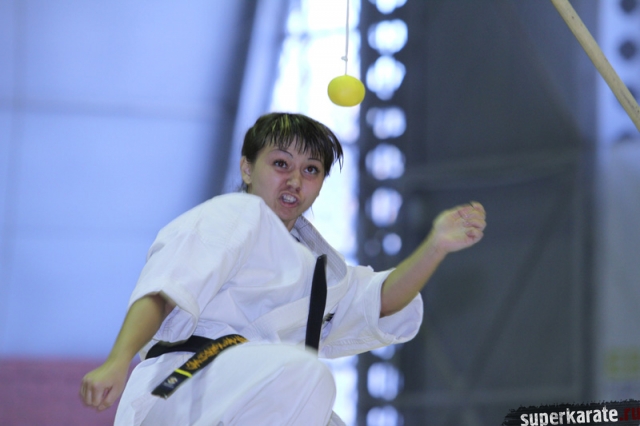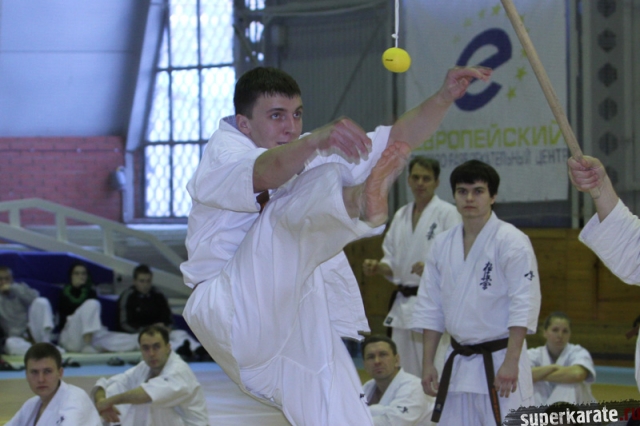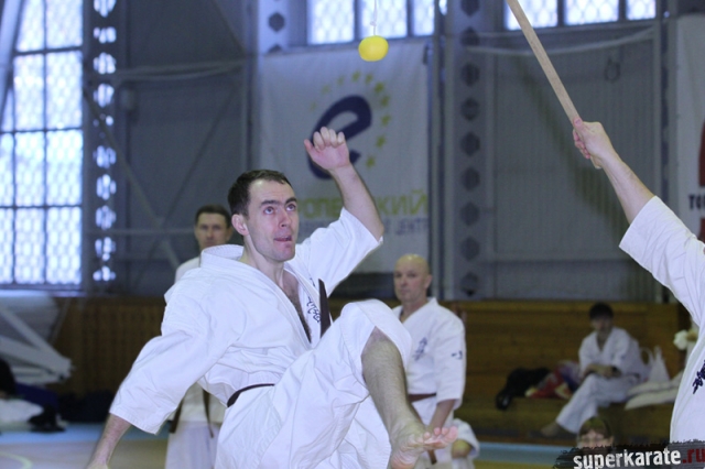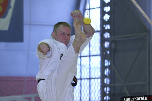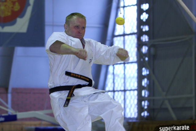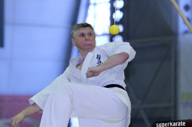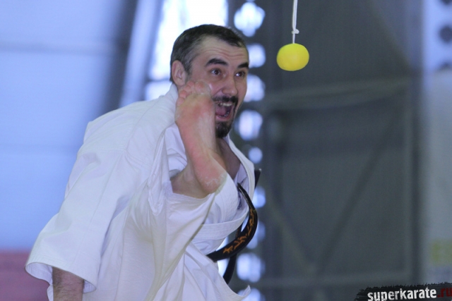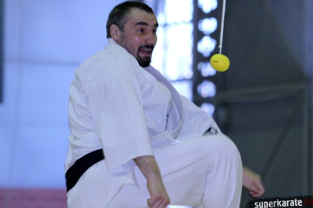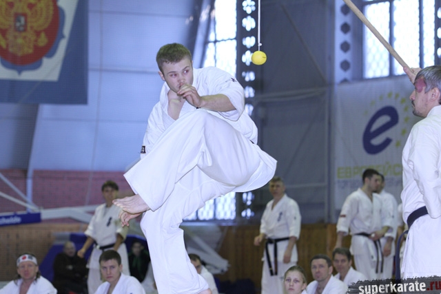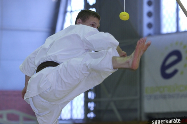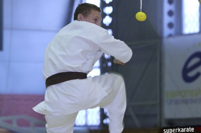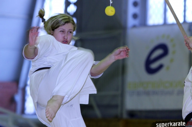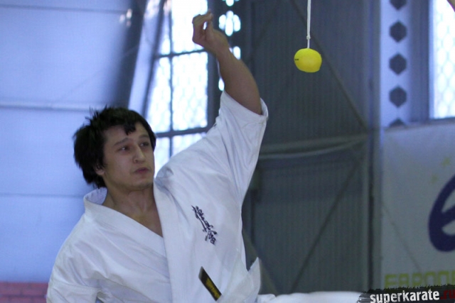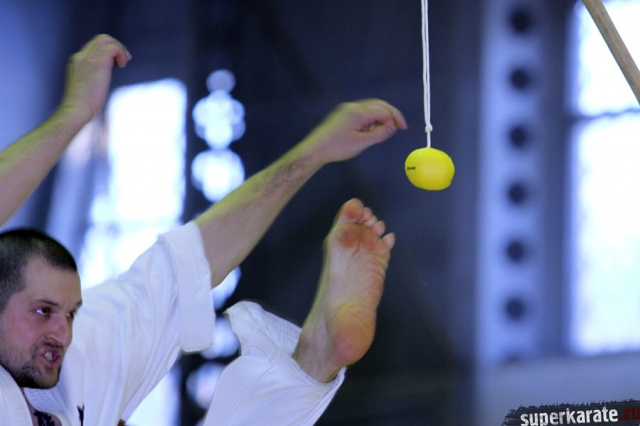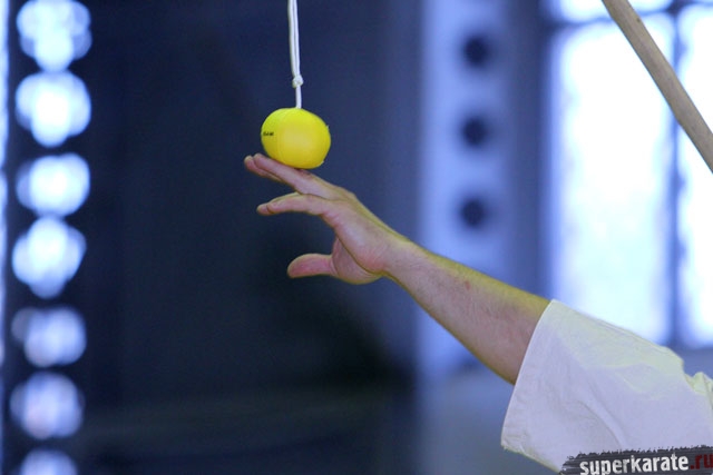 Удар в прыжке по мячику на точность является одним из трех испытаний при сдаче на пояса. В зависимости от степени, на которую претендует тестируемый, изменяется высота мяча над уровнем головы - от 0 до 30 см.