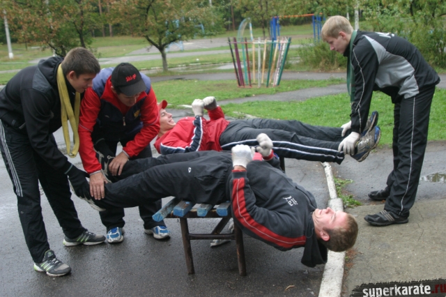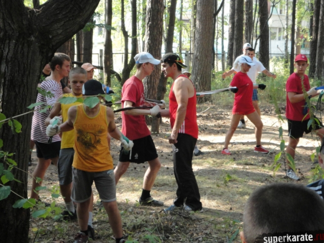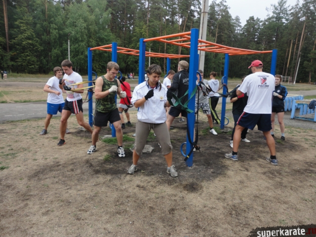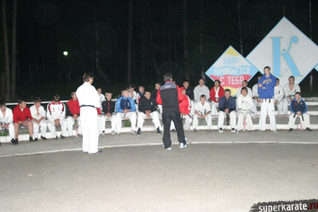 Сэнсей Киприянов на вечерней тренировке разбирает с участниками сборов тонкости и секреты ведения боя и тактико-технические хитрости. А также помогает каждому спортсмену справится с возникающими проблемами во время боя и советует ту манеру ведения боя, которая приведет бойца к победе.