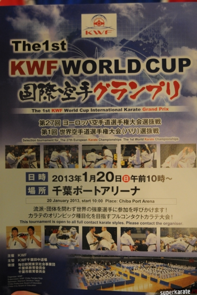 20 января в Чиба (Япония) пройдет 1 Кубок Мира KWF. Из Российских бойцов в турнире принимают участие Алексей Горохов, Арсен Хачатрян и Ирина Кряжева. Сегодня прошла мандатная комиссия и взвешивание участников. Ожидается, что в соревнованиях примут участие около 800 спортсменов. Из Японии, России, Армении, Украины, Казахстана, Аргентины, Испании, Польши, Франции, Турции, Норвегии, Пакистана, Голландии. Турнир планируют проводить на 6 татами: от детей до ветеранов.