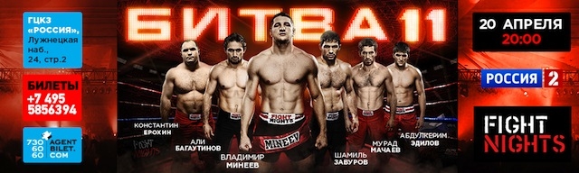 20 апреля в Москве в «Лужниках» (ГЦКЗ «Россия) компания FIGHT NIGHS проводит грандиозное спортивно-светское событие «Битва под Москвой 11». Зрителю будут предложены захватывающие поединки по правилам кикбоксинга и смешанных единоборств (ММА). По уже полюбившейся традиции ведущие российские бойцы FIGHT NIGHTS будут противостоять искушённым противникам из-за океана, а исход каждого поединка будет непредсказуем до его завершения.