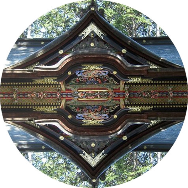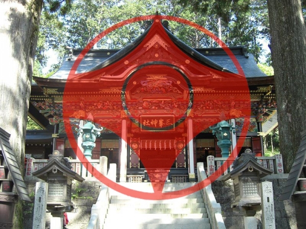 Рассмотрим каждую половинку, и при помощи компьютерных технологий наложим канку. Что мы увидим - острые вершины канку точно ложатся на главный храм Мицуминэ, а широкие концы повторяют крышу главных ворот.![]()