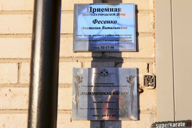 Есть в Благовещенске киокушиновское здание, где на двух этажах, помимо спортивного зала, находится офис Благовещенской городской общественной организации киокушинкай каратэ и общественная приемная депутата Анатолия Фесенко.