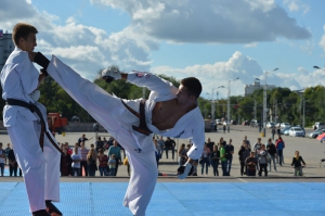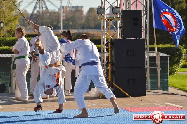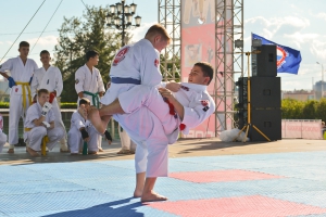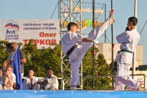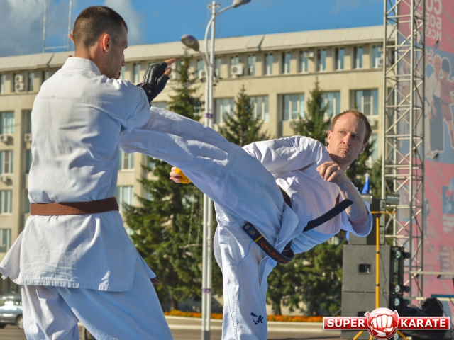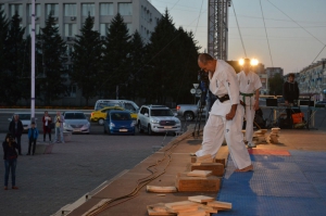 Самый зрелищный и показательный момент благотворительного марафона - чемпионат по тамешивари. Во имя добра разбивать доски различными частями тела вызвались маститые каратисты: Анатолий Фесенко, Константин Хахулин, Евгений Кацан, Евгений Смирнов и Владимир Шаронов.