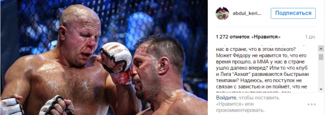 «Руководство страны ставит перед обществом, властью и СМИ задачу заниматься вопросами патриотического и духовно-нравственного воспитания подрастающего поколения, пропагандировать здоровый образ жизни, высокую нравственность, духовность. Это основа стабильности и могущества страны. Ситуация вызывает тревогу. Только в первом полугодии против детей совершено 50256 преступлений, включая убийства и насильственные действия сексуального характера. Никто за нас не решит проблему, если каждый не поймёт свою ответственность перед будущим. Но нередко те, кто в этом должны показывать пример, занимают странную позицию. Я с пониманием отнёсся бы к ответам и реакции Фёдора Емельяненко на показательное выступление мальчиков в ходе турнира Grand Prix Akhmat-2016, если бы он начал, сказав доброе слово о турнире и его значении. Как русский богатырь и патриот поздравил бы Чечню с праздниками, отметил бы факт розыгрыша первого пояса ММА, хотя бы раз приехал в Чечню, посмотрел, как мы проводим турниры и развиваем спорт. А так его заявления вызывают ряд вопросов. Странно выглядит и резонанс, провоцируемый Фёдором, ибо каждый обязан начинать с себя и семьи. Это касается и близких. Но выставлять фото чужих детей, и провоцировать под ним нелестные комментарии, есть прямое нарушение этики и морали. Мы в Чечне используем все формы и методы для выполнения поручения Руководства России, активно приобщаем детей и молодёжь к спорту. В Чечне нет детдомов, приютов, беспризорных детей. Нет преступлений против детей или это большая редкость. Нигде не ведётся такая комплексная работа по защите прав детей, как в Чечне. Почему именно показательный поединок, в форме детской игры, воспринят как ужас, а не то, что война унесла жизни 13987 детей, погибли сотни тысячи человек, пять тысячи человек пропали без вести, разрушены до основания Грозный и вся Чечня. Говорили вы про ужас, когда всё это происходило? Стоит даже чихнуть, начинаются сказки про налоги. Мы также платим налоги, поставляем лучшую в мире нефть, газ! А дотации получаем, как и многие регионы. Мы с детства растим патриотов и защитников России. Фёдор, вы неправы! Русские богатыри так не поступают!», - заявил руководитель Чеченской республики в своем Instagram.