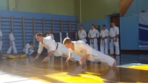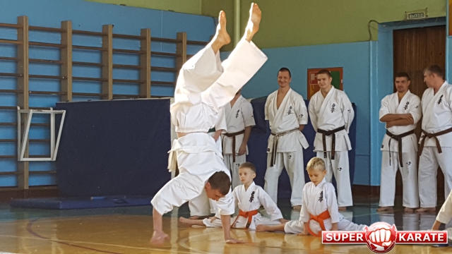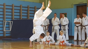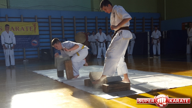Сначала силу духа и тела демонстрировали юные киокушиновцы, которые пришли в мир единоборств пару-тройку лет назад. Спортсмены демонстрировали акробатические упрожнения, ходили на руках, виртуозно крутили колесо и прыгали через палку и пояс.