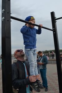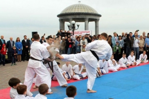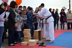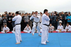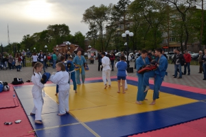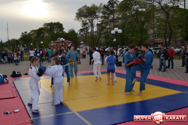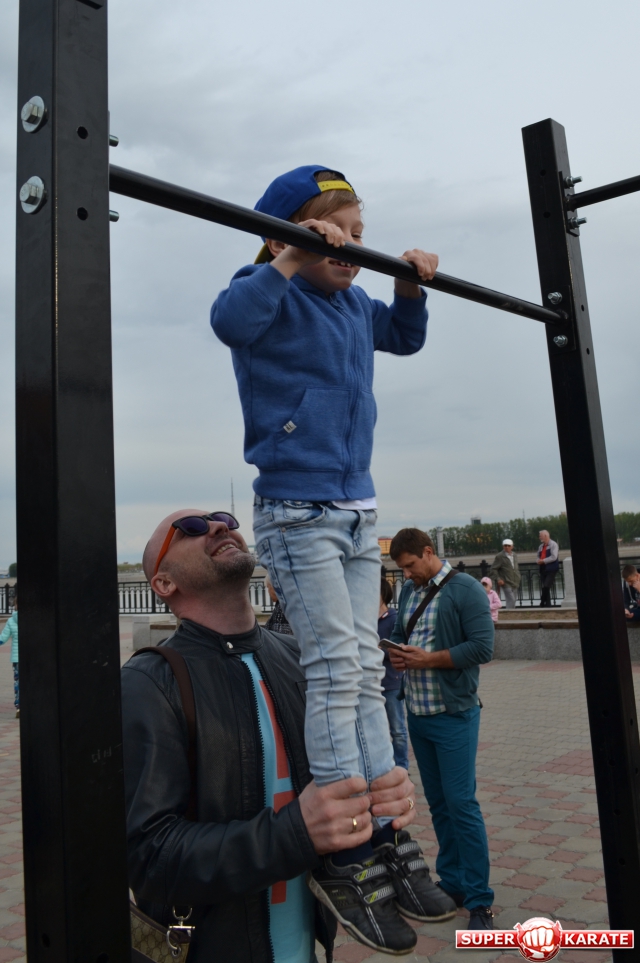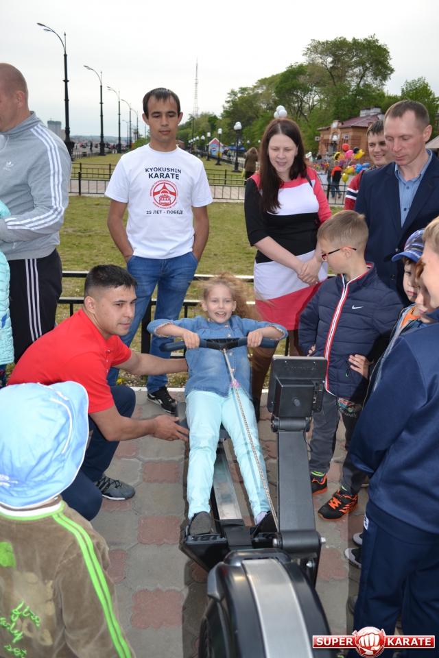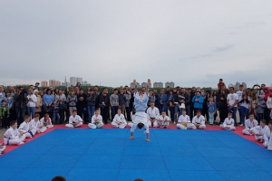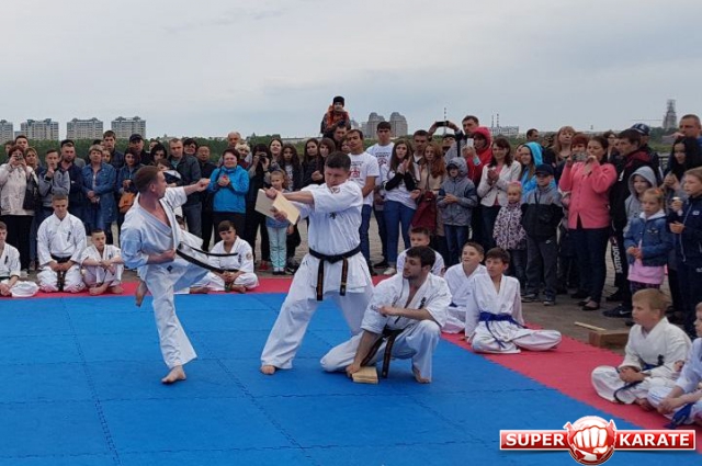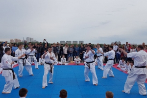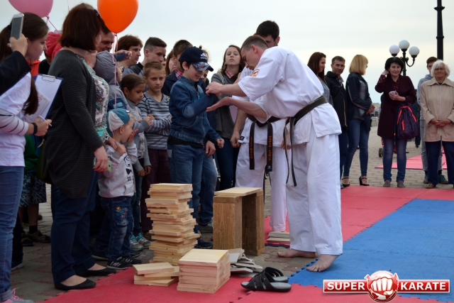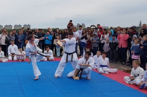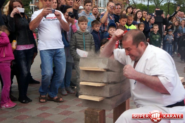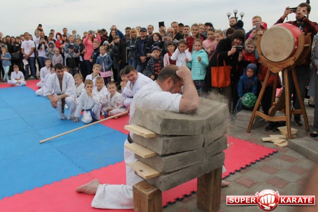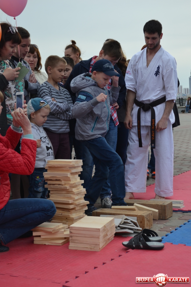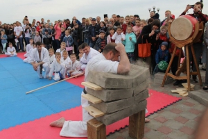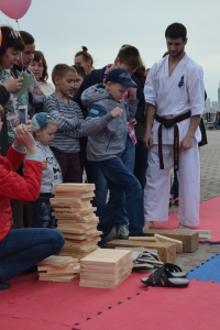 Гости торжества могли принять участие в мастер-классах по каратэ киокушинкай, испытать свои силы на турниках и тренажерах, а также каждый желающий мог проверить свои силы в тамэшивари (разбивание твердых предметов).![]()