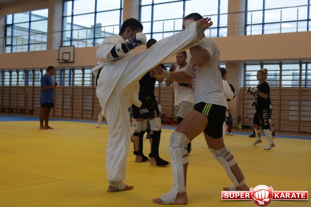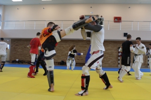 Тренировка была посвящена отработке спарринговых техник в парах. После игровой разминки спортсмены провели несколько легких разминочных поединков, а затем отрабатывали входы с дальней дистанции, эффективные защиты и контратаки.