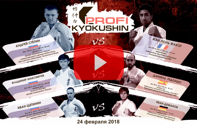 А также три профессиональных поединка по правилам Киокушин Профи, в которых встретятся пары: Андрей Степин и Жан-Поль Жакот, Владимир Максимчев и Даниель Редондо, Иван Щетинин и Иван Деманов.
