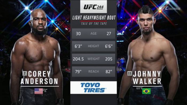 В дни и недели, предшествующие турниру UFC 244, Кори Андерсон часто говорил о своем разочаровании в компании UFC, которая не предлагает ему титульный бой или, по крайней мере, бой с главным претендентом, а вместо этого даёт ему бой с Уокером. И решил выместить это разочарование на предложенном ему в оппоненты бразильским бойцом, добившись остановик боя через 2:07 первого раунда.