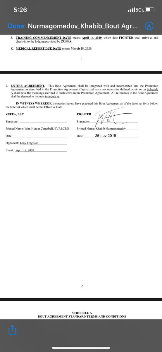 «Вот и мы. Чемпион подписал соглашение о поединке с Тони Фергюсоном. Этот человек просил, чтобы ему надрали задницу, и теперь он это получит. 18 апреля Орел ещё раз приземлится в Бруклине».