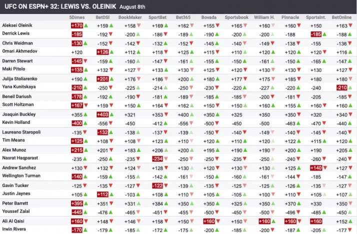 Льюис известен тем, что нокаутирует своих соперников, а Олейник побеждает болевыми и удушающими приёмами. Естественно, коэффициенты ставок привязывают это потенциально 25-минутное главное событие к тому, что всё закончится рано. Опорная ставка «бой не дойдёт до решения» имеет строго благоприятную денежную линию -700, а опция «бой дойдёт до решения» помечена как здоровенный андердог +460.
