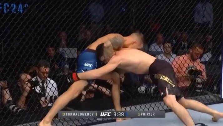 Именно в этот момент Нурмагомедов изменил свою позицию и получил пространство, где он мог дышать. Вскоре чемпион был вне опасности и начал угрожать удушающим приёмом сзади. Затем удушающий был выполнен, и бесспорный титул выскользнул из рук Пуарье.