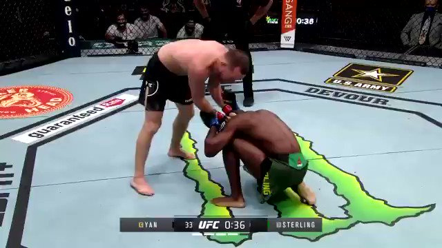 И вот злополучный четвёртый раунд. Пётр Ян уверенно вёл бой. Он попадал, переводил в партер. Стерлинг держался, но было видно, что сил у него, практически, не осталось. И вот на последней пятой минуте этого раунда Ян в очередной раз прервал попытку Стерлинга перевести бой в партер и, через какое-то время, пробил коленом голову по сидящему на одном колене сопернику.