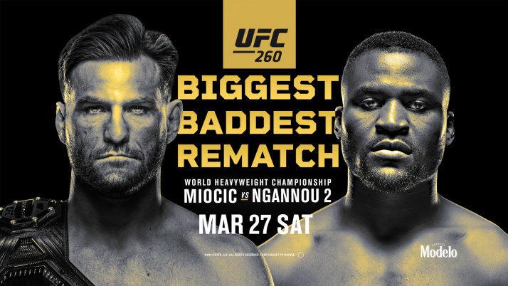 В главном событии турнира UFC 260 чемпион в тяжелом весе Стипе Миочич будет защищать свой титул в тяжелом весе во второй раз с момента возвращения пояса. Миочич войдёт в клетку после того, как он провёл три боя подряд с Даниэлем Кормье, где проиграл первый, но выиграл последние два боя. Нганну, тем временем, войдёт в клетку после четырех побед подряд, которые были одержаны нокаутом в первом раунде, и его самый длинный бой в этой серии длился всего 71 секунду.