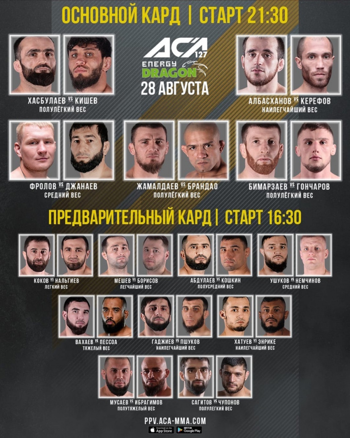Опубликован полный кард турнира по смешанным единоборствам АСА 127, который пройдет в Краснодаре 28 августа 2021 года. Прелимы мероприятия примут старт в 16.30. Что касается основных поединков, то они начнутся в 21.30, а в главном бою вечера сойдутся россияне Магомедрасул Хасбулаев и Рамазан Кишев. 34-летний самбист из Дагестана Хасбулаев в марте 2021 года провел свой последний поединок, в котором одержал верх над бразильцем Фелипе Фроесом. Уроженец Карачаево-Черкесской Республики 29-летний Кишев в прошлом бою встречался с Асхабом Зулаевым и был признан победителем в результате единогласного решения судей.