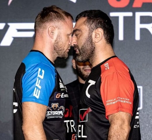 После традиционной процедуры взвешивания перед турнирoм промоушена Eagle FC, который пройдет 17 октября в Сочи, прошла дуэль взглядов между Александром Шлеменко и Артуром Гусейновым.