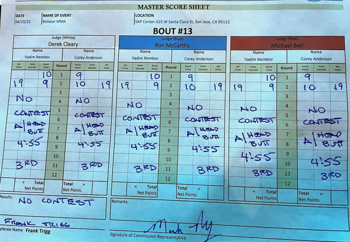 Кори Андерсон проиграл первый раунд – Немков доминировал в стойке. Поэтому вторую пятиминутку американец решил провести в партере, что привело к его доминированию благодаря контролю. Третий раунд начался по сценарию предыдущего. Но в одном из эпизодов атлеты сильно столкнулись головами, у Немкова открылась сечка.