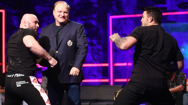 Российский боец смешанного стиля Магомед Исмаилов и бывший звездный атлет UFC американец Майк Перри устроили потасовку на пресс-конференции "Бойцовского клуба Рен-ТВ".