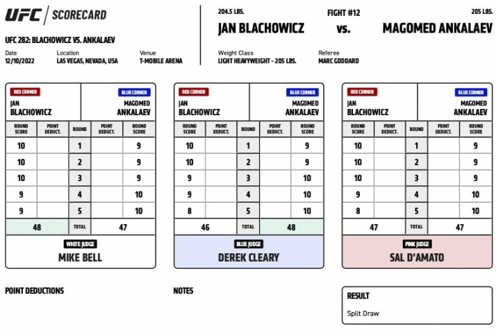 После пяти раундов чемпионского поединка один судья решил, что победил Анкалаев, второй отдал победу Блаховичу, а у третьего получилась ничья… Как итог – ничья, титул чемпиона UFС в полутяжах остается вакантным.