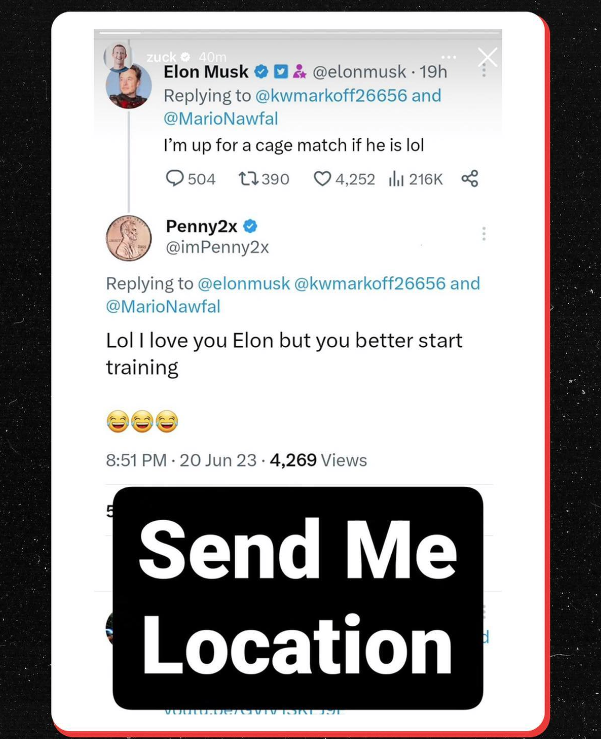 Цукерберг сделал скриншот переписки Маска в Twitter и выложил у себя в сторис, сделав подпись: «Send me location», то есть буквально «Скажи, куда мне приехать».