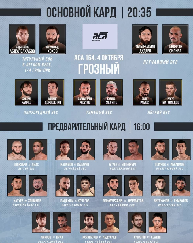 4 октября проходит турнир по смешанным единоборствам ACA 164, в главном противостоянии которого сойдутся Мухамед Коков и Абдул-Азиз Абдулвахабов, на кону будет титул в легком весе.