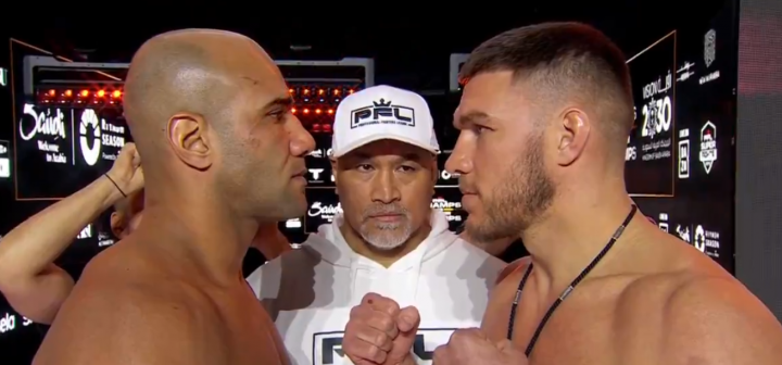 Российский боец Вадим Немков и бразилец Бруно Каппелоцца прошли процедуру взвешивания перед поединком на турнире «PFL против Bellator: чемпионы» в Саудовской Аравии. Трехраундовый бой в тяжелом весе состоится в Эр-Рияде в ночь на воскресенье, 25 февраля.