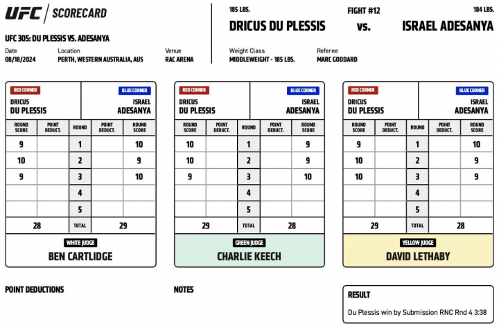 Утром 18 августа в главном поединке турнира UFC 305 состоялся титульный бой в среднем весе между обладателем пояса Дрикусом Дю Плесси и экс-чемпионом Исраэлем Адесаньей.