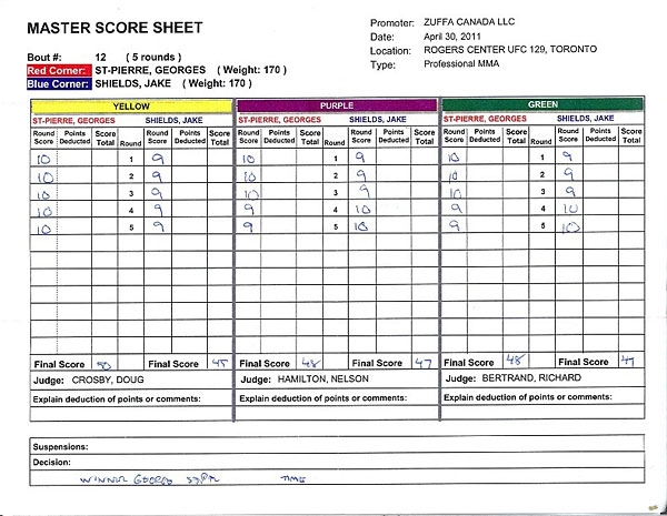 Наконец-то опубликован официальный документ с оценками судей боя между Жоржем Сен-Пьером и Джейком Шилдсом на UFC 129 в Канаде.