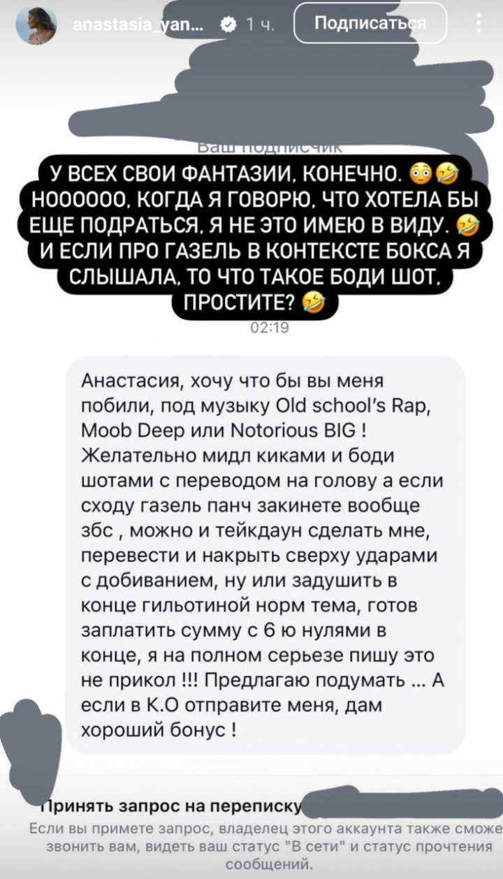 «Анастасия, хочу, чтобы вы меня побили под музыку Old school's Rap, Moob Deep или Notorious BIG! Желательно мидл-киками и боди-шотами с переводом на голову, а если сходу газель-панч закинете — вообще збс, можно и тейкдаун сделать, перевести и накрыть сверху ударами с добиванием, ну или задушить в конце гильотиной. Норм тема, готов заплатить сумму с 6 нулями в конце. Я на полном серьезе пишу, это не прикол! Предлагаю подумать. А если в нокаут отправите — дам хороший бонус!» — написал Яньковой подписчик.