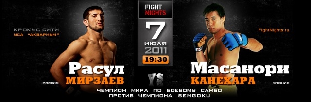 7 июля в Москве Крокус-Сити состоится Битва под Москвой 4 серии FIGHT NIGHTS. Сразу 10 боев! за один вечер по самым зрелищным видам единоборств: тайскому боксу, боевому самбо и MMA. В рамках спортивной части FIGHT NIGHTS состоится Бой за титул ЧЕМПИОНА МИРА в весовой категории до 65 кг: Расул «Черный Тигр» Мирзаев (Россия) и Масанори Канехара (Япония).