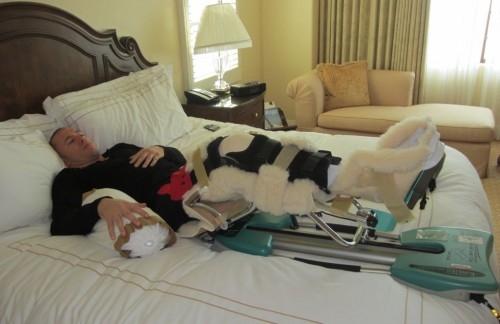 Сейчас в отношении Сент-Пьера применяется CPM-терапия (Continuous Passive Motion), или терапия «постоянного пассивного движения». На фотографии видно, что нога Сен-Пьера находится в «объятиях» специального устройства, которое является ключевым в восстановительном процессе.