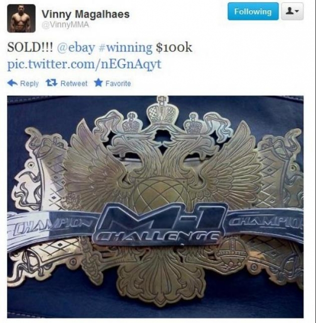 Спортсмен выставил свой чемпионский пояс на интернет-аукционе eBay, стартовая цена составила всего…1 доллар да еще и с бесплатной доставкой. Однако, спрос оказался велик и превзошел самые смелые ожидания Винни – всего за несколько часов сумма предложения составила уже $20.000.В течение дня ставки продолжали уверенно расти, более 100 заинтересованных почитателей спортсмена «доторговались» до суммы, равной $90.100.